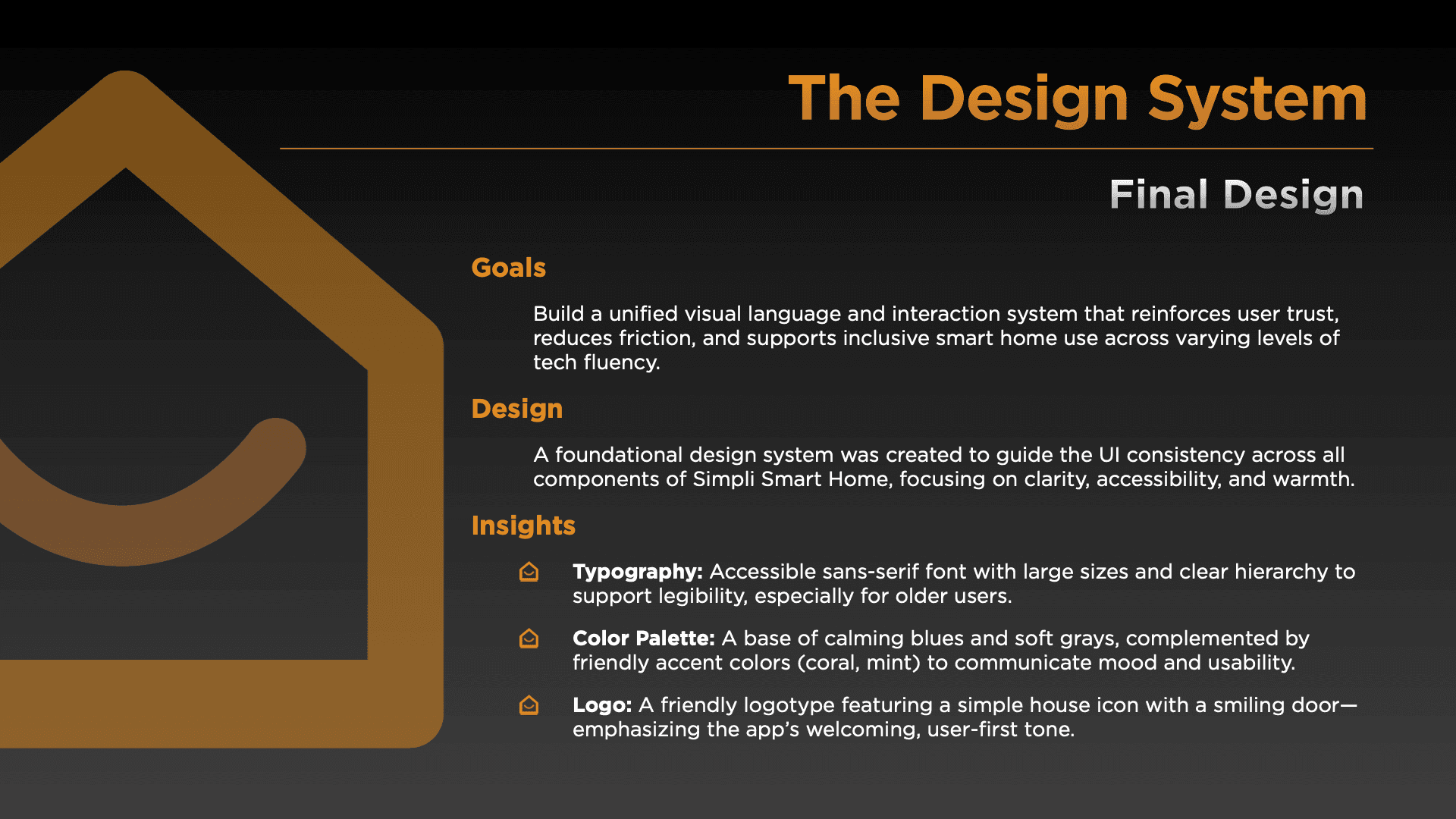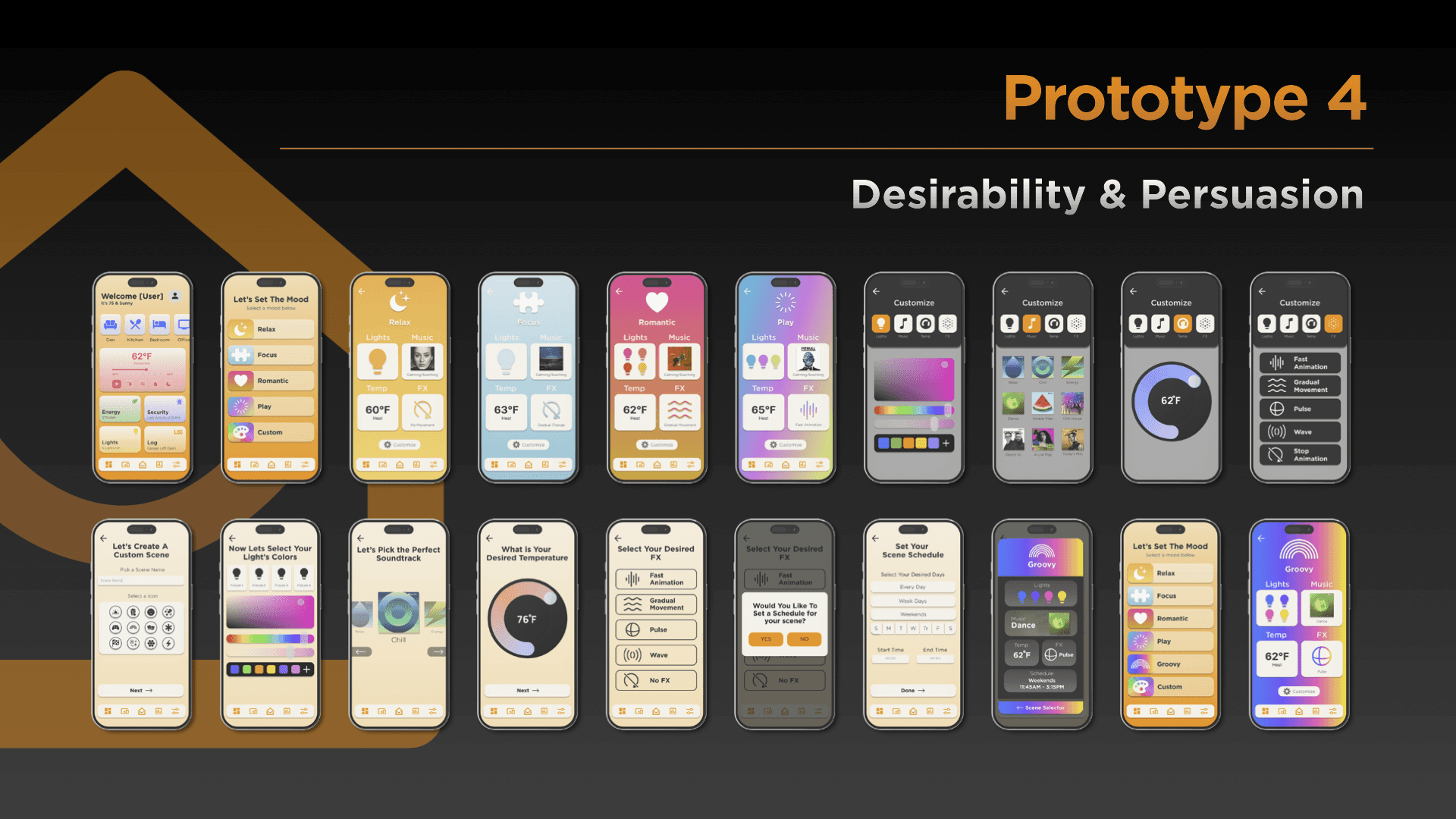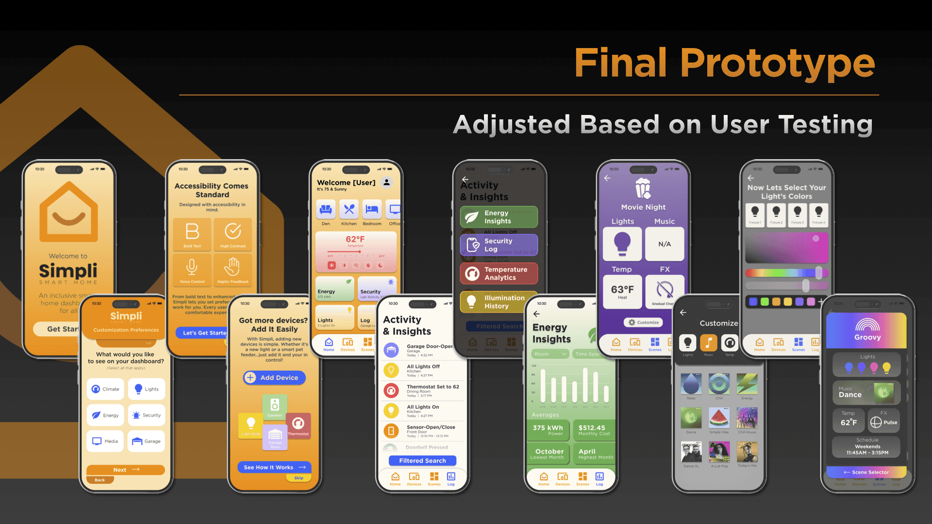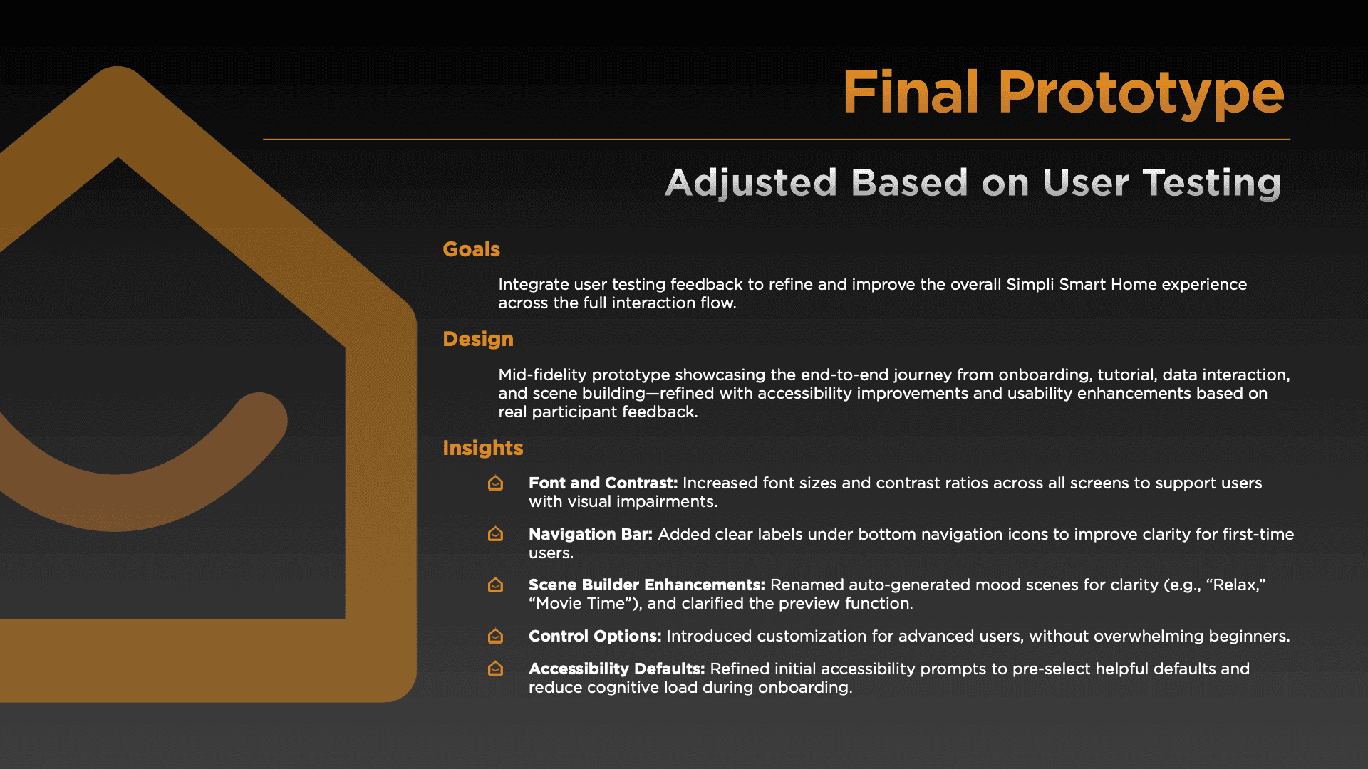 The refined prototype offers an end-to-end experience with user testing baked in, from personalized onboarding to accessible dashboards and mood-based automations. The visual system uses calming colors, friendly typography, and touch-friendly components to welcome every kind of user home.