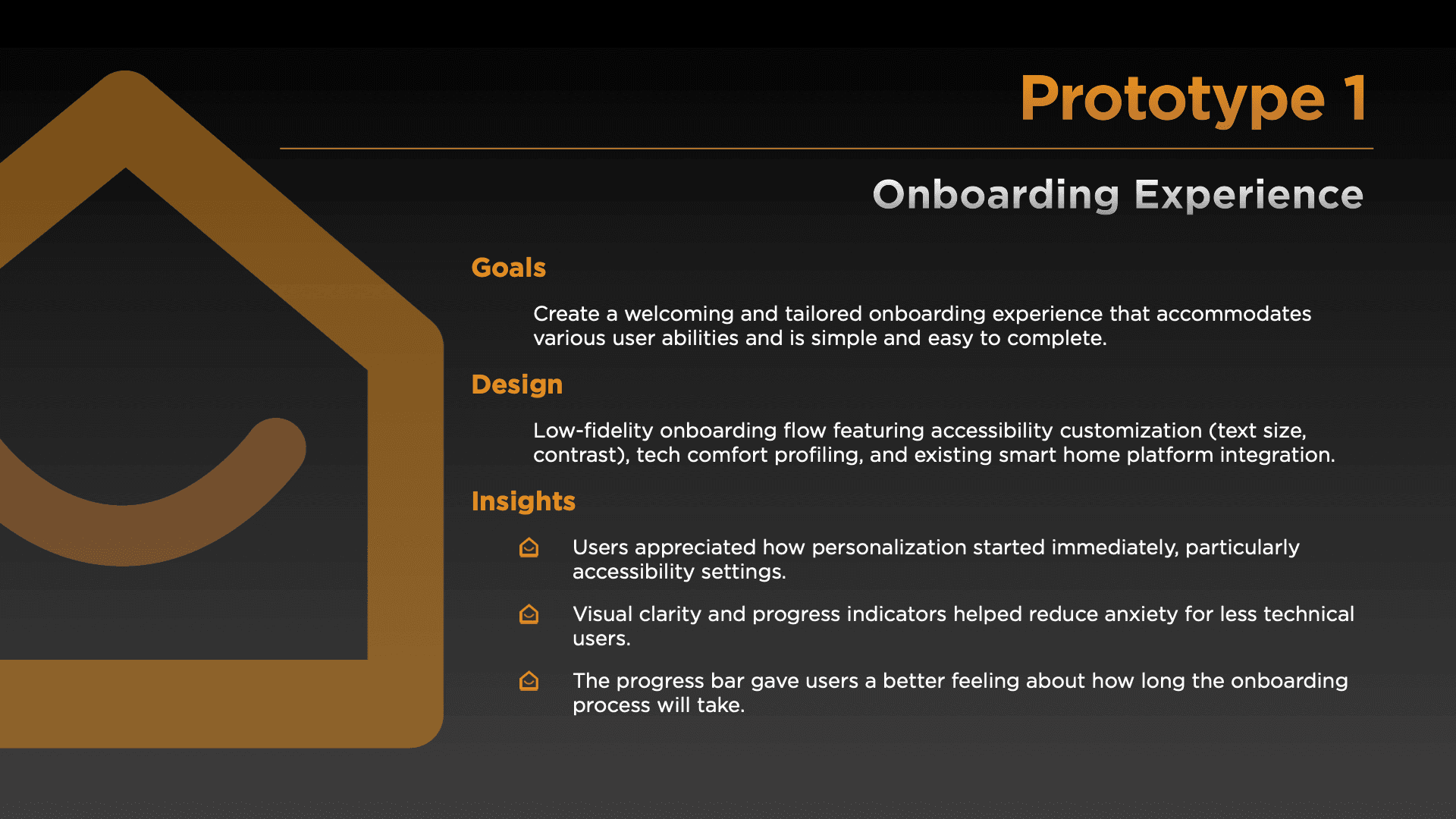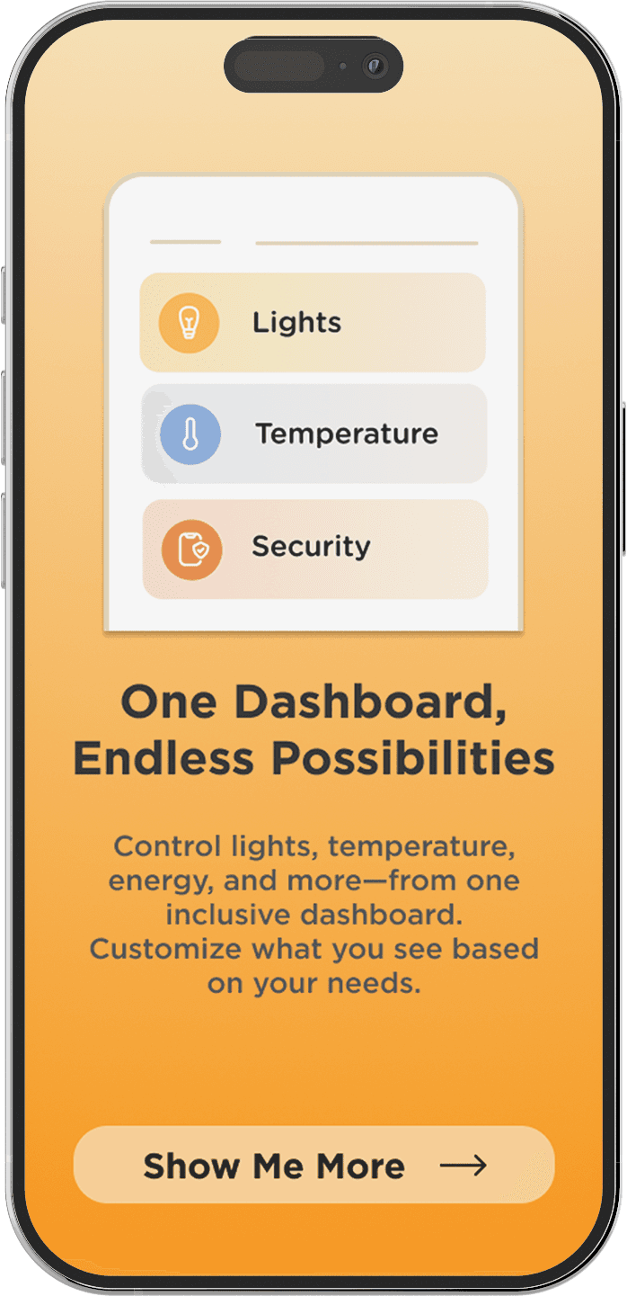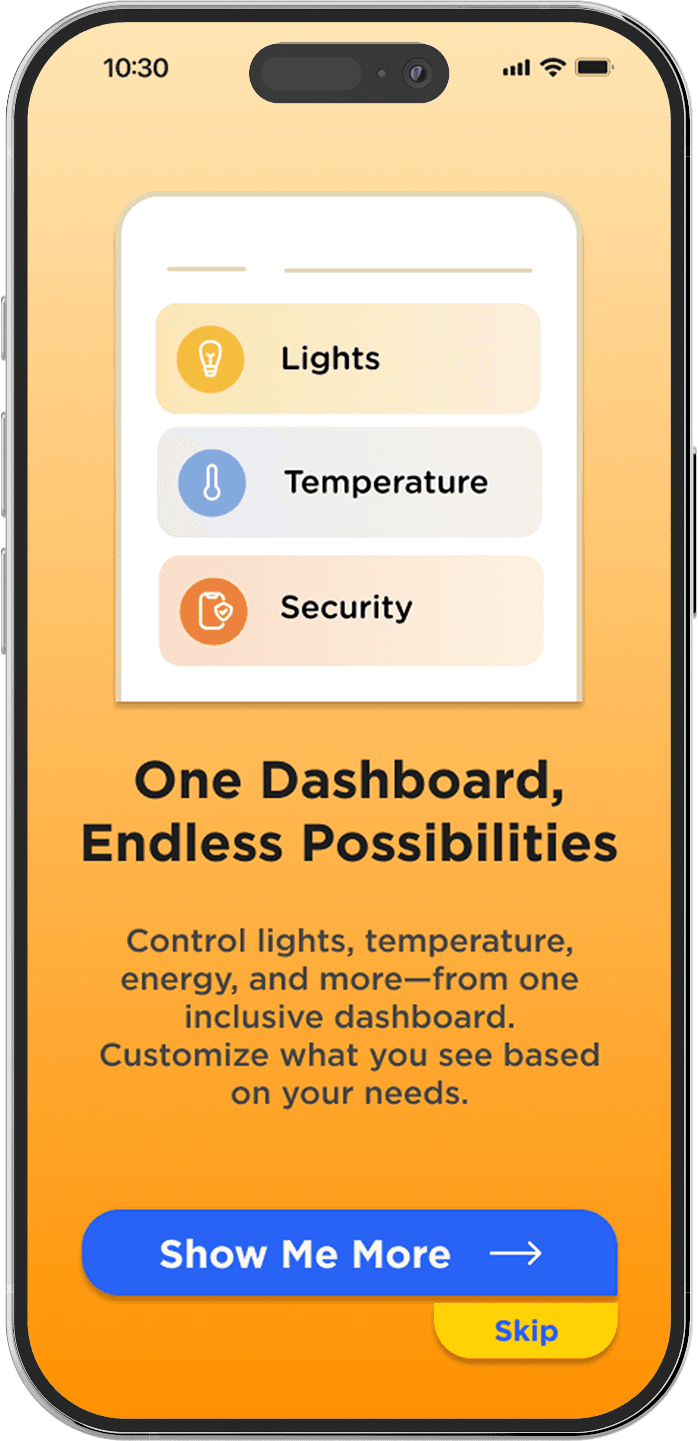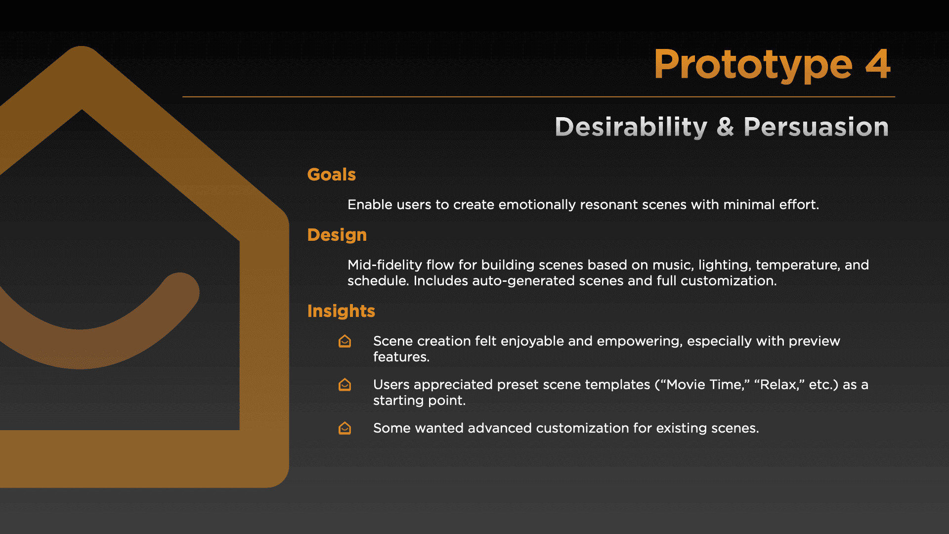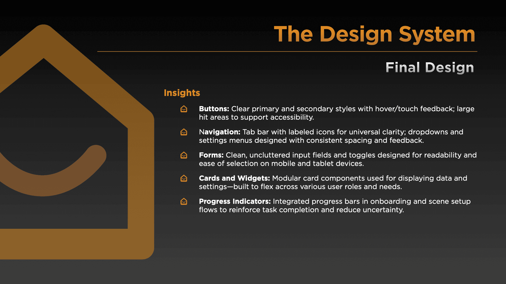 The refined prototype offers an end-to-end experience with user testing baked in, from personalized onboarding to accessible dashboards and mood-based automations. The visual system uses calming colors, friendly typography, and touch-friendly components to welcome every kind of user home.