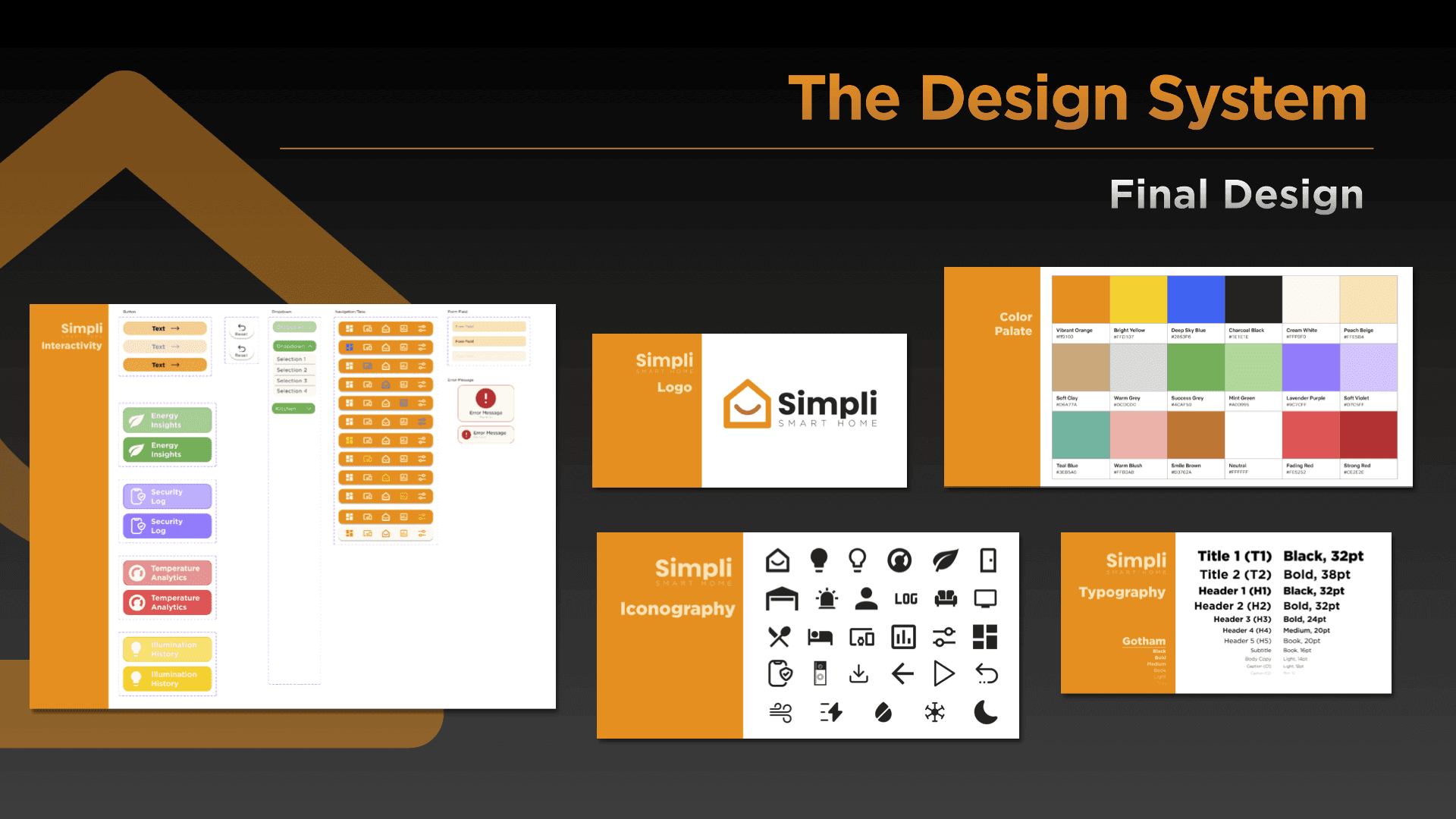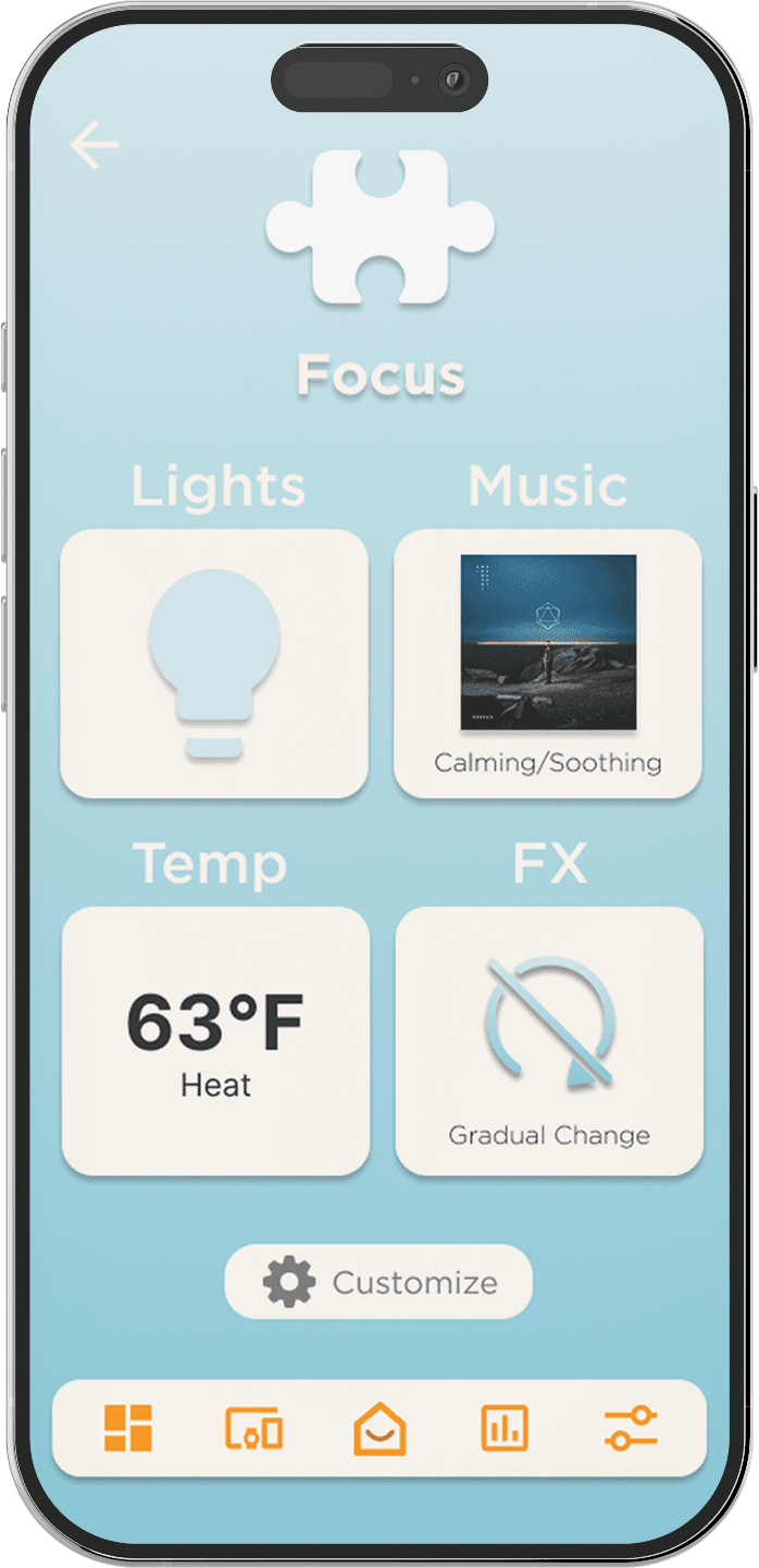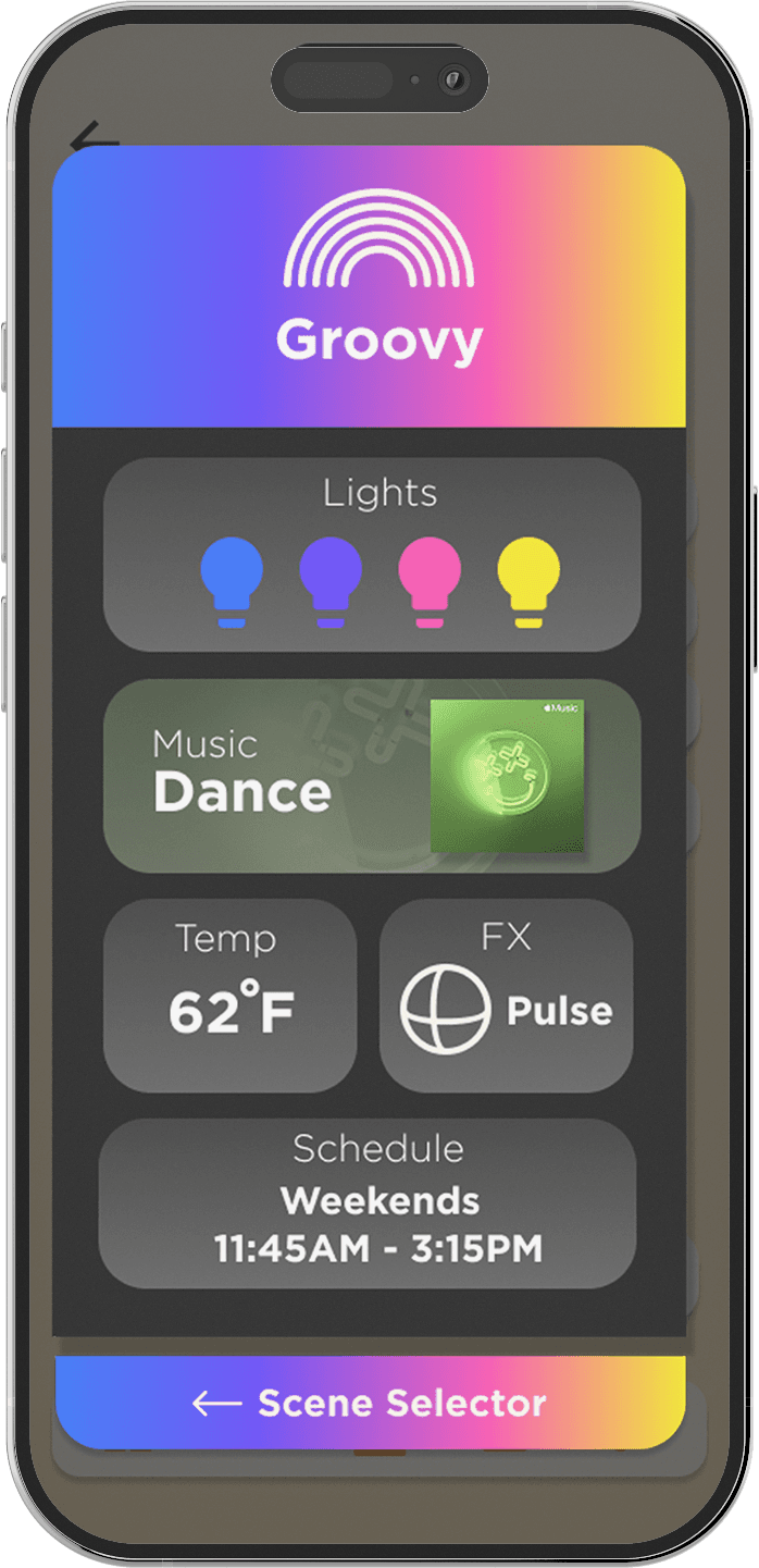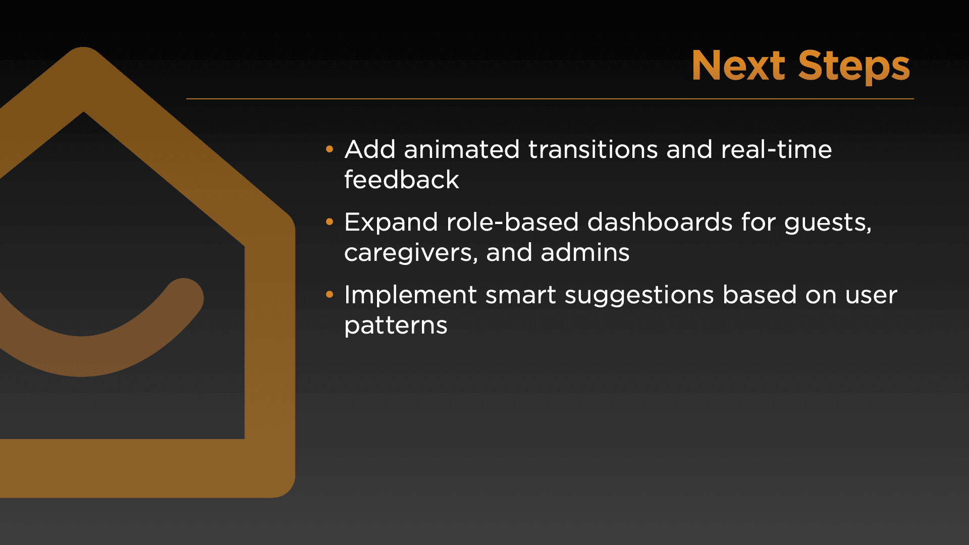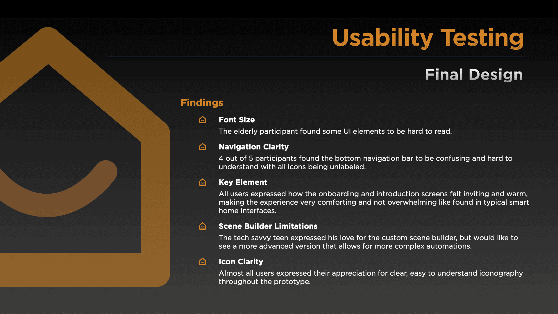 The refined prototype offers an end-to-end experience with user testing baked in, from personalized onboarding to accessible dashboards and mood-based automations. The visual system uses calming colors, friendly typography, and touch-friendly components to welcome every kind of user home.