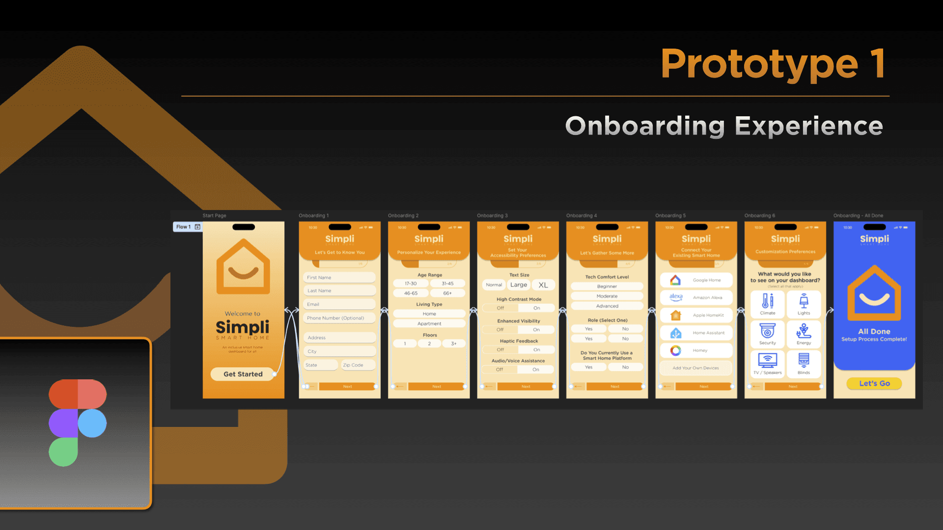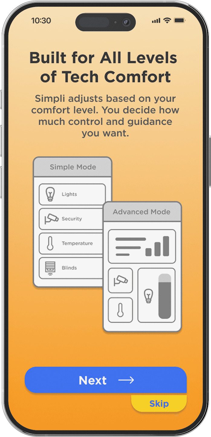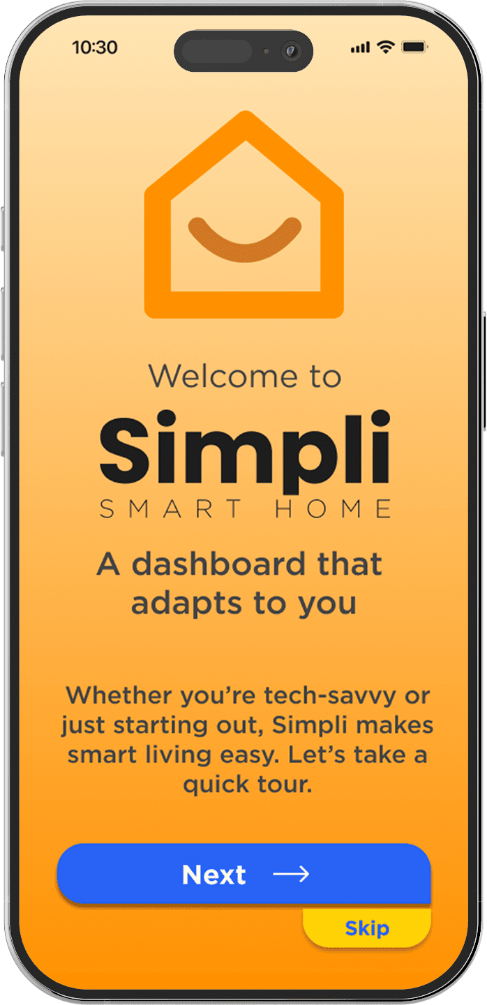 Simpli Smart Home is a customizable dashboard designed as a layer on top of existing smart home platforms. Built with inclusive design principles, the app simplifies onboarding, enhances accessibility, and brings emotional warmth to smart home control. It offers both beginner-friendly experiences and advanced customization for tech-savvy users.