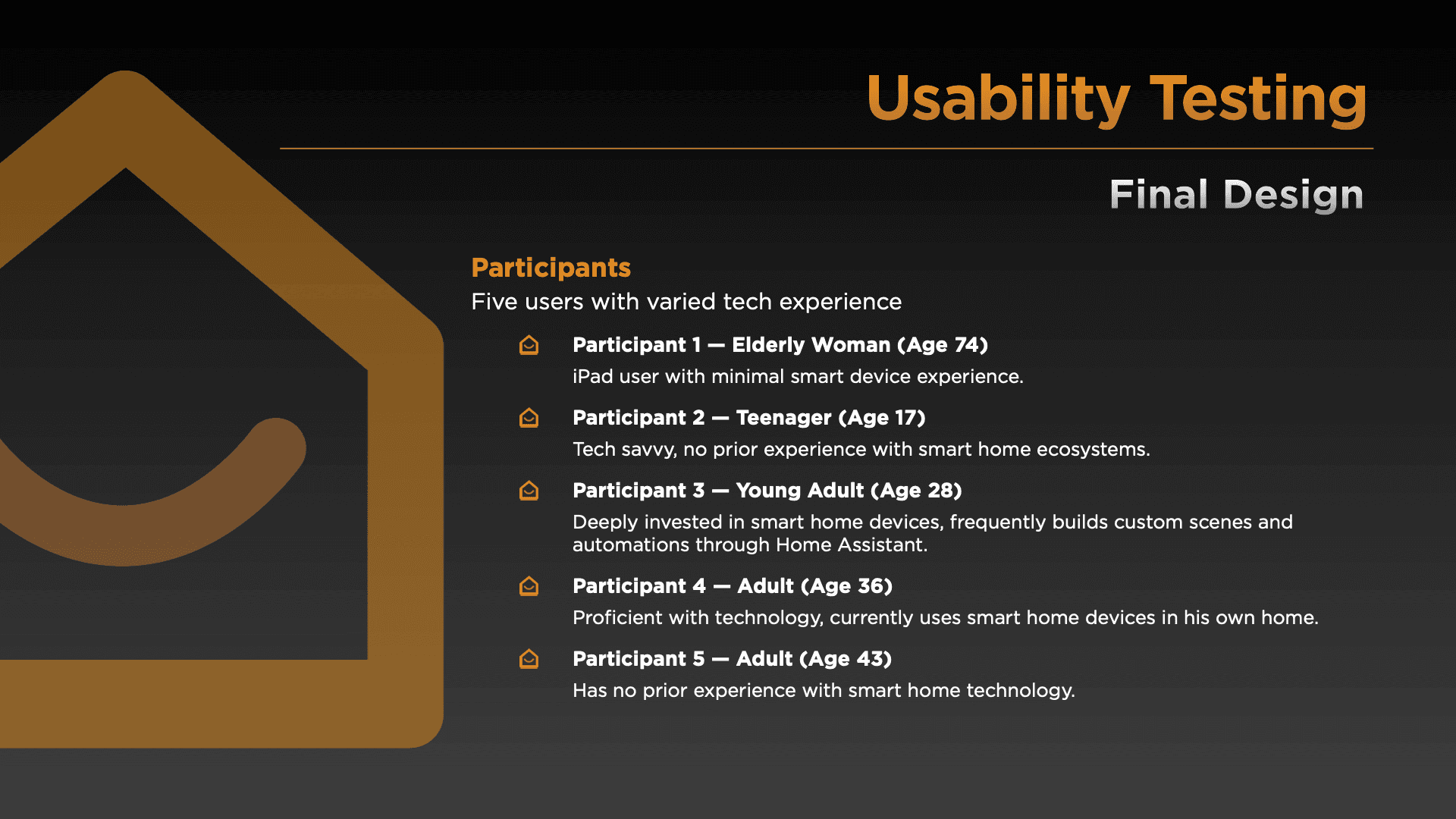 A wide range of users—from a 74 year old with no smart home experience to a 28 year old Home Assistant power user.